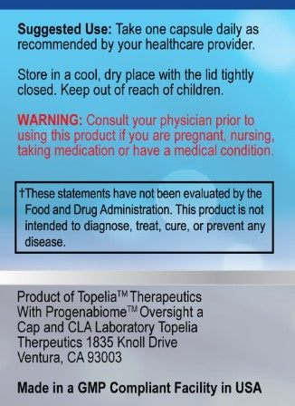 - Product of Topelia Therapeutics with Progenabiome Oversight, a CAP and CLA laboratory